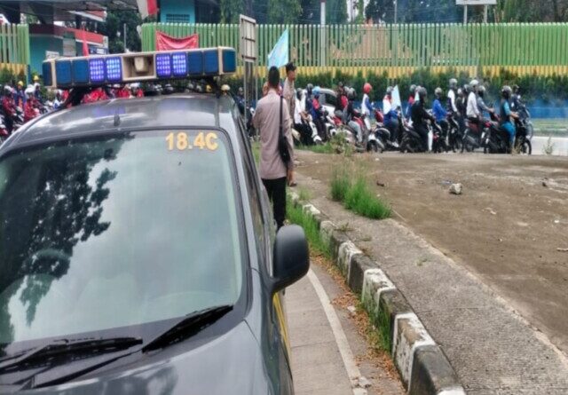 Kapolsek Cikampek Pimpin Langsung Pengamanan Pemberangkatan Aksi Buruh “Karawang Poek ” ke Pemda Karawang