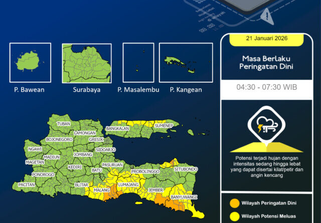 Read MorePeringatan Dini Cuaca Wilayah Jawa Timur tgl 21 Januari 2026 pkl. 04:00 WIB berpotensi terjadi hujan dengan intensitas sedang hingga